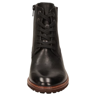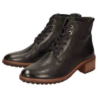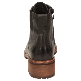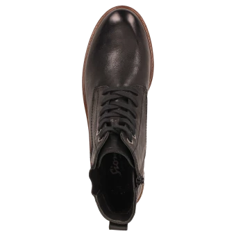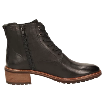 Bottine à lacets pour femme avec talon de 35 mm, chaussant G bien large, en cuir nappa de veau souple huilé. La fermeture éclair intérieure et le petit empiècement extensible à l’extérieur assurent un enfilage aisé. Doublure intérieure en tissu microfibre à rembourrage en mousse, avec première de propreté en cuir matelassée sur toute la longueur. La semelle extérieure fine et légère en caoutchouc assure un confort de marche optimal tout en ayant très belle allure.