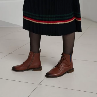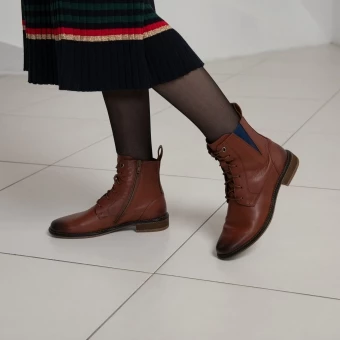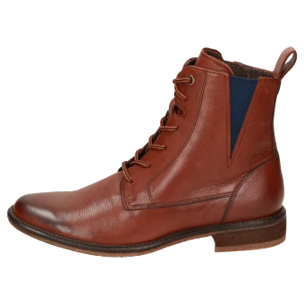 Bottine à lacets pour femme de Sioux avec fermeture éclair intérieure et empiècement élastique extérieur pour un chaussant optimal, tirant caractéristique sur le talon. En cuir de veau souple foulé avec doublure en tissu microfibre. La première de propreté revêtue de cuir garantit un bon amorti et la semelle extérieure profilée en caoutchouc, dans le ton de l’automne, est rehaussée d’une trépointe en cuir.