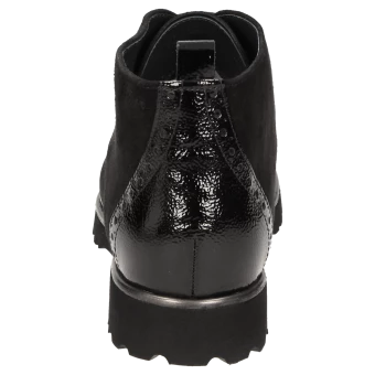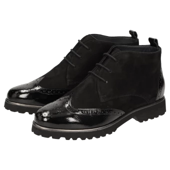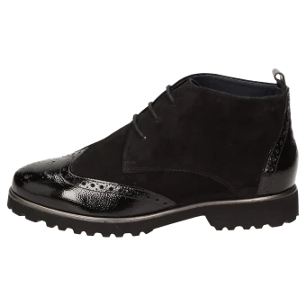 Bottine à lacets pour femme en largeur H avec tirant au talon, bout golf classique doté de perforations décoratives. Composée d’un mélange de cuir velours d’agneau souple et de cuir de veau verni, elle est doublée en cuir d’agneau fin et dotée d’une doublure en tissu stretch à l’avant. Convient aux pieds avec hallux valgus ! Semelle intérieure amovible revêtue de feutre avec rembourrage moelleux. Possibilité de la remplacer par une semelle orthopédique. Semelle en caoutchouc légère et crantée, adaptée à l’automne avec cadre en cuir prononcé.