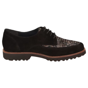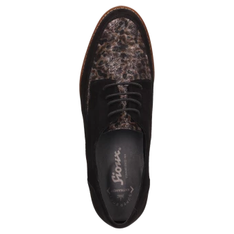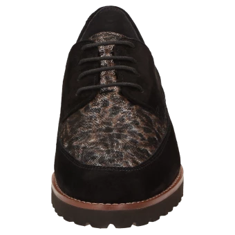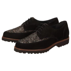Chaussure à lacets pour femme au chaussant H extra-large. Fabriquée en cuir velours d’agneau fin et cuir de chèvre à l’effet léopard suggéré, intérieur cuir avec doublure en tissu stretch à l’avant du pied. Convient aux pieds avec hallux valgus ! La première de propreté rembourrée et revêtue de cuir peut être retirée pour la remplacer par une semelle sur mesure. La semelle extérieure profilée en caoutchouc léger est dans le ton de l’automne avec sa trépointe cuir marquante.