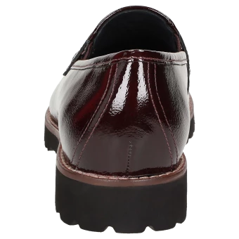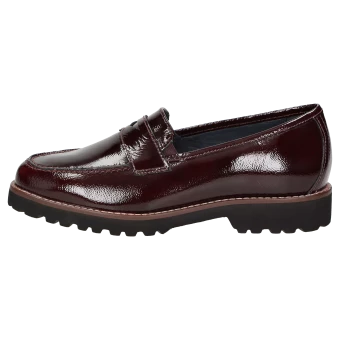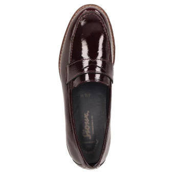 Mocassin pour femme au chaussant H extra-large, avec ornement penny loafer. Fabriqué en cuir verni fripé, intérieur cuir avec doublure en tissu stretch à l’avant du pied. Convient aux personnes souffrant d’hallux valgus ! La première de propreté rembourrée et revêtue de cuir peut être retirée pour la remplacer par une semelle sur mesure. La semelle extérieure profilée en caoutchouc léger est dans le ton de l’automne avec sa trépointe cuir marquante.