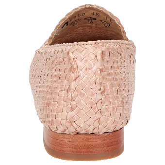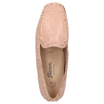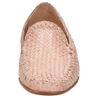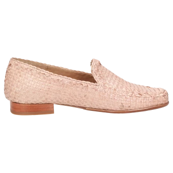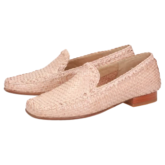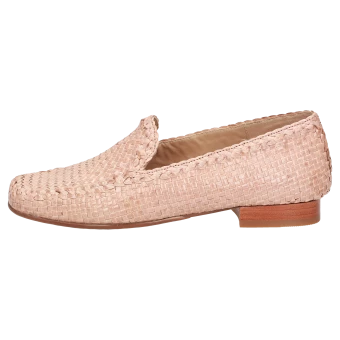 Loafer plat pour femme en cuir de chèvre tressé souple, agrémenté d’une petite bordure sur le contour de tige et la languette. Non doublée, c’est la chaussure idéale à porter pieds nus. L’empeigne est tressée de manière artisanale directement sur l’embauchoir afin de donner au modèle une forme optimale et absolument unique. Semelle intérieure rembourrée en cuir de veau. Semelle extérieure souple et fine en caoutchouc avec un petit talon, largeur F pour pieds normaux.