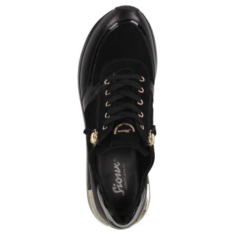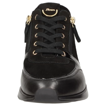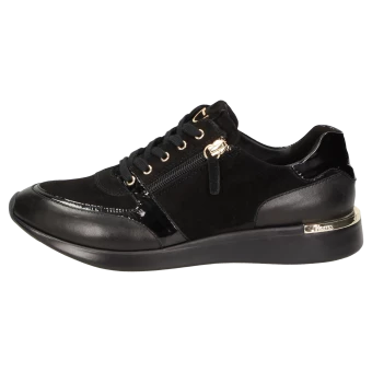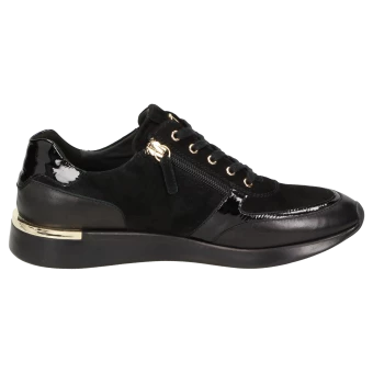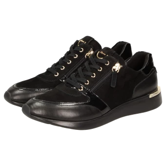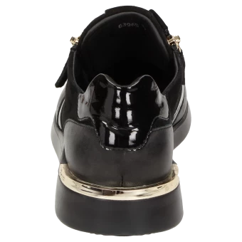 Chaussure de loisirs sportive pour femme en mélange raffiné de cuir nappa de veau, cuir de veau verni et de cuir velours de chèvre. Avec semelle ergonomique revêtue de cuir et facile à remplacer par une semelle orthopédique et talon rembourré surélevé pour un chaussant parfait, facile à enfiler grâce aux deux zips. La semelle en caoutchouc extrêmement légère confère à la chaussure un grand confort.