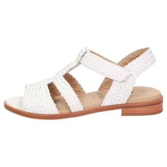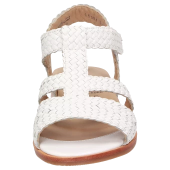 Sandale estivale de très belle fabrication en cuir de chèvre tressé, avec première de propreté en cuir au rembourrage moelleux. Fermeture velcro pour un ajustement parfait. La semelle au profil dentelé marquant amortit bien les pas et contribue au confort en marchant.