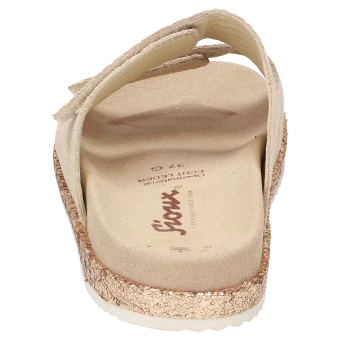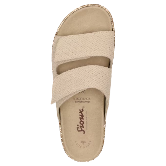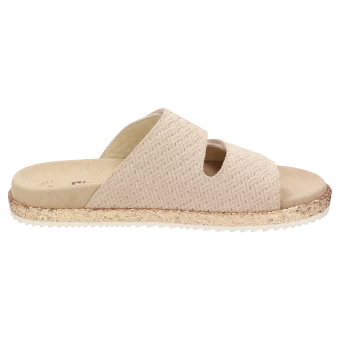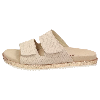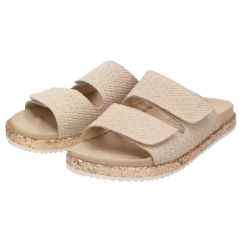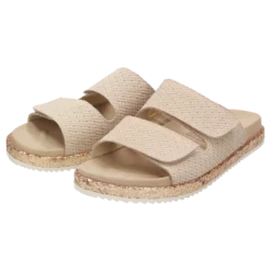 Nouveauté dans l’assortiment d’été et montée immédiate dans les best-sellers. Notre sandale d’été comme mule à la mode est le compagnon idéal et aéré des journées chaudes et ensoleillées, mais aussi un parfait chausson pour femme à utiliser comme pantoufle à la maison. Mule à la mode en daim fin avec impression en aspect tressé. Sandales confortables pour femmes avec semelle souple et anatomique pour un confort accru. La semelle extérieure en caoutchouc légèrement nervurée avec un bord pailleté très tendance complète parfaitement cette sandale d’été.