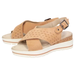 Confortable sandale pour femme à lanières croisées en cuir velours de chèvre fin, première de propreté au rembourrage extra-souple et chaussant G bien large. La boucle fixée sur une bande élastique assure un très bon maintien. La semelle légèrement compensée et le revêtement liège sur le talon lui donnent une allure tendance.