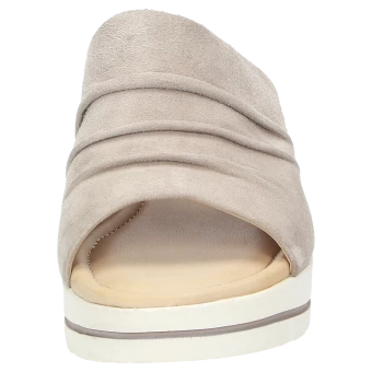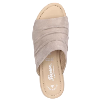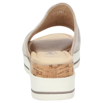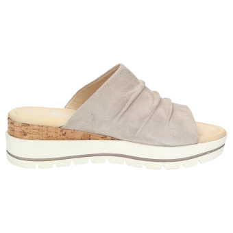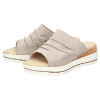 Confortable sandalette pour femme à lanières croisées en cuir velours de chèvre fin, première de propreté en cuir au rembourrage extra-souple et chaussant G bien large. La boucle fixée sur la bande élastique assure un très bon maintien. La semelle légèrement compensée et le revêtement liège sur le talon lui donnent une allure tendance.